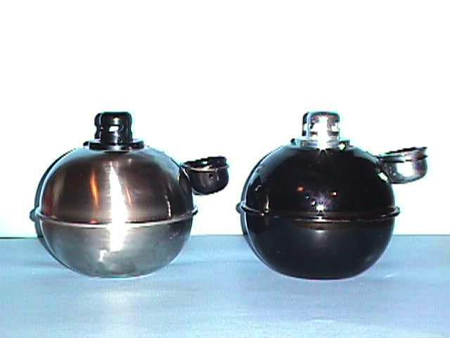 The black torch with silver burner and cap is made in the U.S.A. by Fisher-Barton and is made from original "Toledo Torch" dies and is so marked. (F-B no longer offers the flat-bottom version.) These (in black and green, not red or blue) may be ordered on-line at Premiere Products .